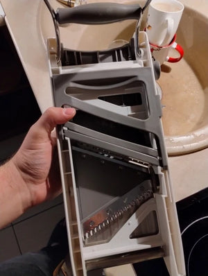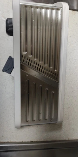 Cette mandoline permet de réaliser toutes les opérations souhaitées : coupes droites, coupes gaufrées et ondulées, petites juliennes et grosses frites.
